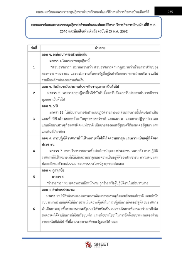 – แนวข้อสอบพระราชกฤษฎีกาว่าด้วยหลักเกณฑ์ และวิธีการบริหารบ้านเมืองที่ดี พ.ศ. 2546 และที่แก้ไขเพิ่มเติมถึง (ฉบับที่ 2) พ.ศ. 2562