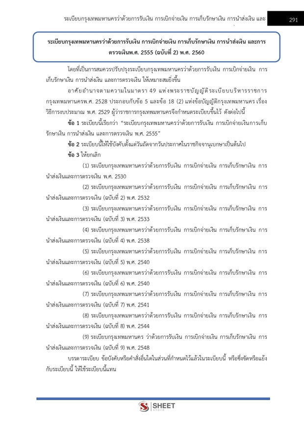 – แนวข้อสอบระเบียบกรุงเทพมหานครว่าด้วยการรับเงิน การเบิกจ่ายเงิน การเก็บรักษาเงิน การนำส่งเงิน และการตรวจเงินพ.ศ. 2555 (ฉบับที่ 2) พ.ศ. 2560