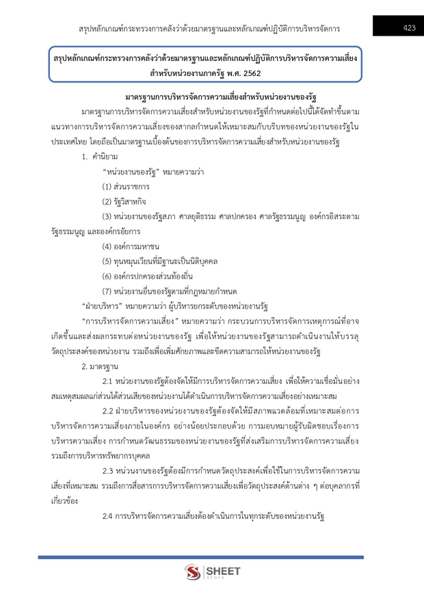 – แนวข้อสอบสรุปหลักเกณฑ์กระทรวงการคลังว่าด้วยมาตรฐานและหลักเกณฑ์ปฏิบัติการบริหารจัดการความเสี่ยง สำหรับหน่วยงานภาครัฐ พ.ศ. 2562