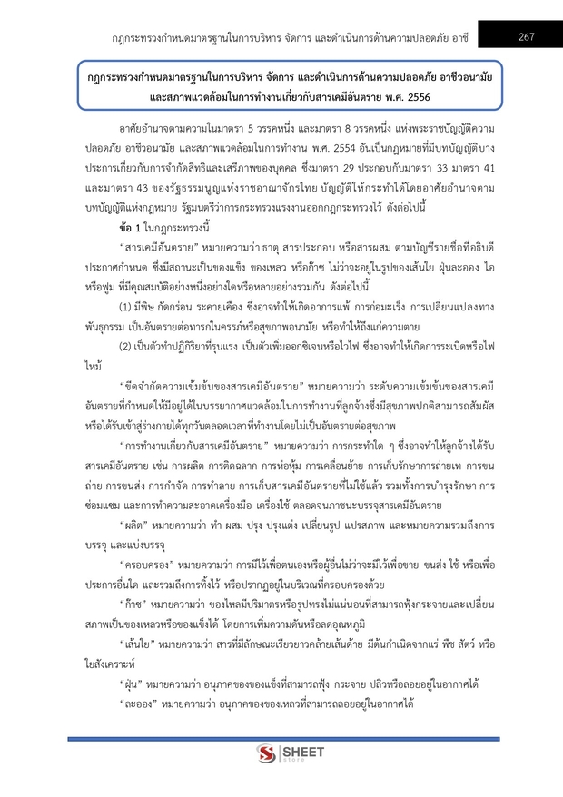 – แนวข้อสอบกฎกระทรวงกำหนดมาตรฐานในการบริหาร จัดการ และดำเนินการด้านความปลอดภัยอาชีวอนามัย และสภาพแวดล้อมในการทำงานเกี่ยวกับสารเคมีอันตราย พ.ศ. 2556